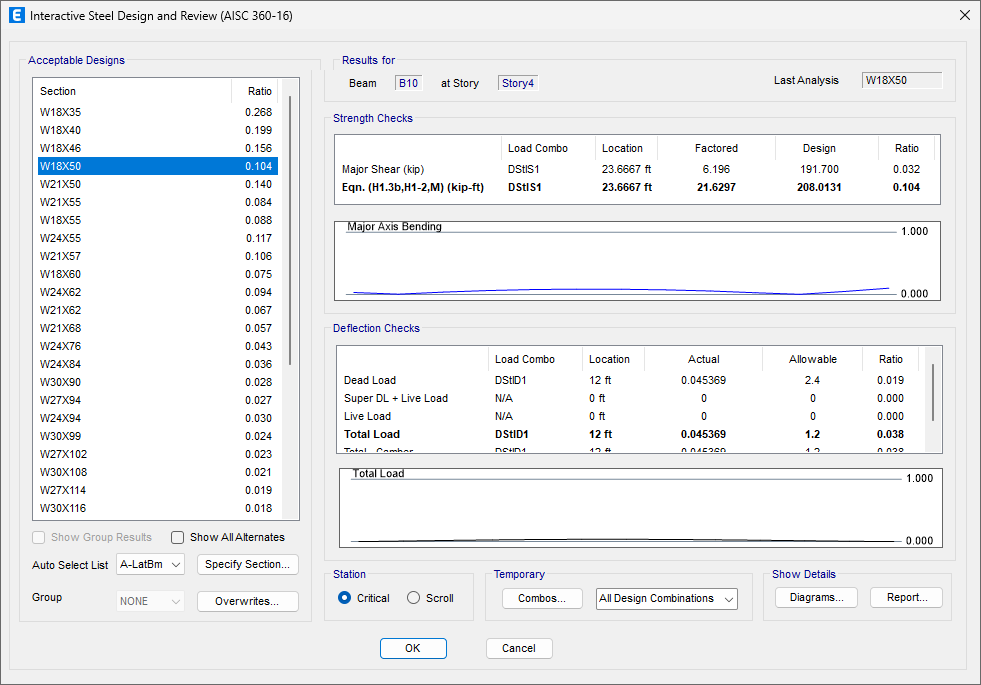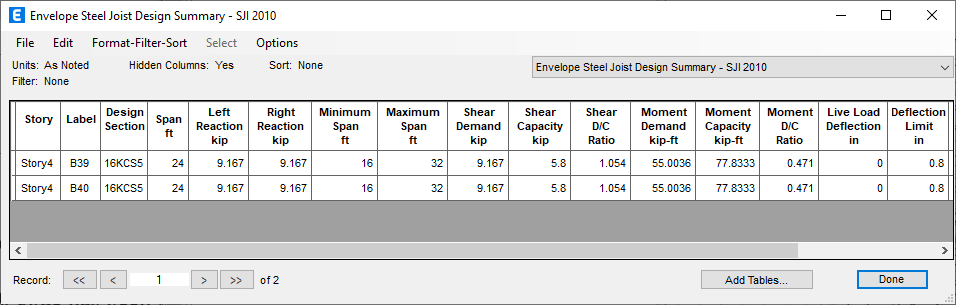 Steel beam deflection ratios are now reported in the steel details table.